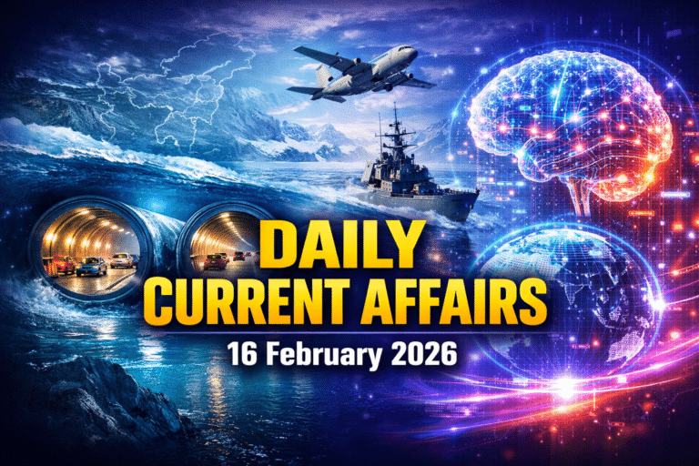 16 February 2026 Current Affairs हाल की प्रमुख राष्ट्रीय, अंतरराष्ट्रीय और खेल जगत से जुड़ी घटनाओं पर आधारित है। यह Current Affairs Questions प्रतियोगी परीक्षाओं की तैयारी के लिए अत्यंत उपयोगी है।